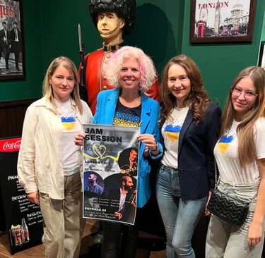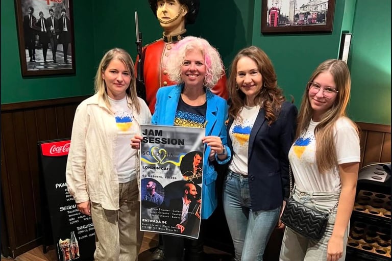 En colaboración con ACU Girasol, el London Café acogió una jam session benéfica donde se reunieron músicos locales para recaudar fondos y visibilizar la labor de la asociación. El evento combinó música en directo —con guitarra, contrabajo, batería y con una cantante Ucraniana con entradas a un precio simbólico, destinadas a apoyar a la comunidad Ucraniana local. La iniciativa refleja una actividad cultural inclusiva que refuerza el tejido social y promueve la participación pública y festiva entre los refugiados ucranianos.